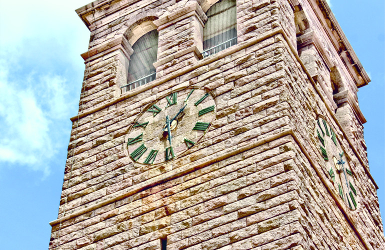 Nella foto: la torre dell'orologio della chiesa di San Ponziano di Carbonia (Sud-Ovest Sardegna, Sulcis).